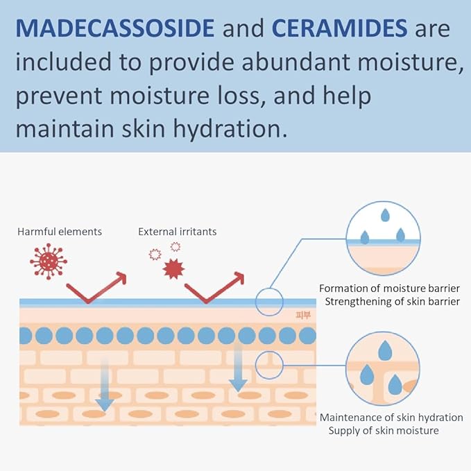 - 🌿 Soothing and Moisturizing Barrier Essence: Enriched with Madecassoside for calming sensitive skin and Ceramide for boosting moisture and barrier strength, this essence helps soothe irritated skin while enhancing its resilience and hydration.