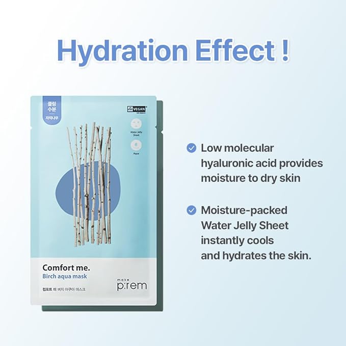 - 🌿Comfort me Birch Aqua Mask - Moisturizing-concentrated mask that provides cooling from essence containing Brich Sap from Finland and low molecular hyaluronic acid, through a water jelly sheet.