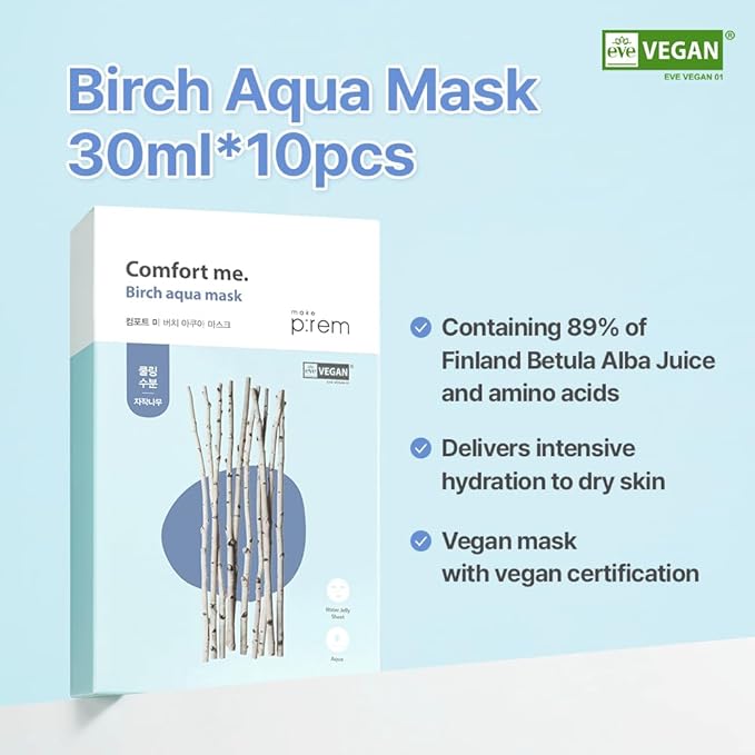 MAKE P:REM Comfort Me. Birch Aqua Mask, Korean Facial Sheet Mask, EWG Green, Soothing & Hydrating Face Mask, EVE VEGAN, 30ml, 1.01 fl.oz. x 10EA