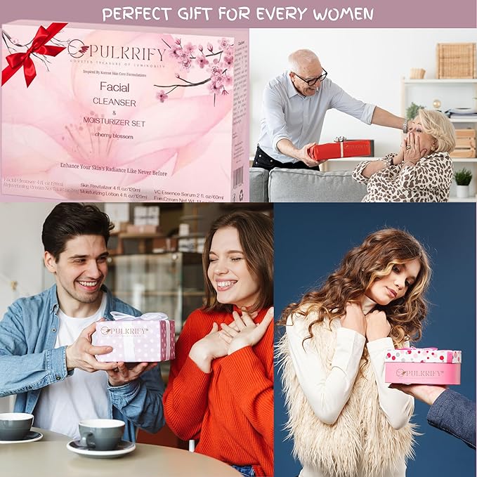 - Comprehensive Set: This 6-pieces luxury face care set from Pulkrify includes a Facial Cleanser, Moisturizing Lotion, Skin Revitalizer/Toner, VC Essence Serum, Rejuvenating Cream and Eye Cream - all infused with the delightful cherry blossom fragrance.