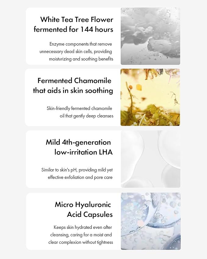 - SOOTHING AND MOISTURIZING INGREDIENTS Formulated with white tea tree flower, fermented chamomile, hypoallergenic LHA, and micro hyaluronic acid capsules, this cleansing balm soothes, moisturizes, and promotes a clear complexion without leaving any tightness after washing.