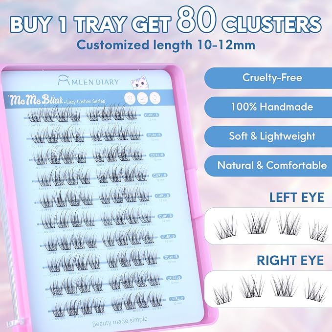 MLEN DIARY Lash Clusters 80PCS Natural Eyelash Clusters C Curl Wispy DIY Eyelash Extensions 10-12mm Soft & Light Eyelash Clusters Korean Manga Style