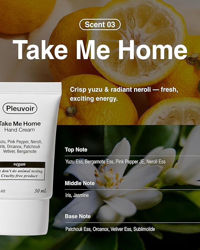 - REFRESHING CITRUS FLORAL FRAGRANCE: Discover the Take Me Home scent, an uplifting citrus fresh hand cream. Bright yuzu and bergamot-like neroli blend with spicy pink pepper, creating an energizing morning fresh scent that boosts mood and confidence.