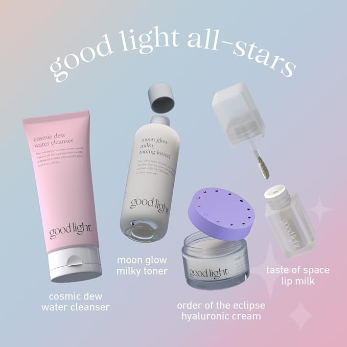 good light All-Stars Kit. An Otherworldly Korean Skincare Set With Our Top-Rated Cleanser, Toner, Moisturizer & Lip Milk. Use As Daily Skincare Routine, Gift Set, Beauty Essentials For Celestial Glow.